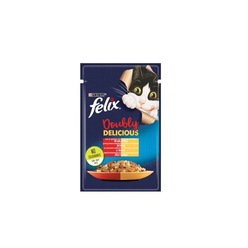 Felix yaş kedi maması, jöle içerisinde, gerçek sığır eti ve kümes hayvanları eti parçacıkları içeren, lezzetli konservedir. Yetişkin kediler için özenle seçilmiş kaliteli içeriği dengeli ve besleyicidir. Felix yaş mama kedinizi heyecanlandıran çifte lezzeti ile kedinizin damak zevkine uygun şekilde hazırlanmıştır. 1 yaş üzeri tüm kedi cinsleri için uygun olan Felix çifte lezzetli kedi maması kısırlaştırılmış kedilerin beslenmesi için de uygundur.