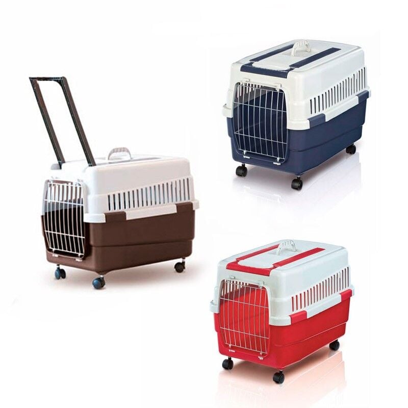 Köpek ve kediler için, metal kapılı kolay temizlenebilen, hijyenik, demonte olabilen, tekerlekli plastik taşıma kabıdır.
