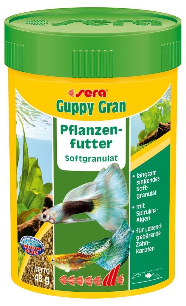 Sera Guppy Gran, özellikle orta ve üst su seviyelerinden beslenen aslen otobur olan tüm süs balıkları için üretilmiş yüksek kaliteli ve dengeli içeriğe sahip taneli bitkisel besin kaynağıdır.